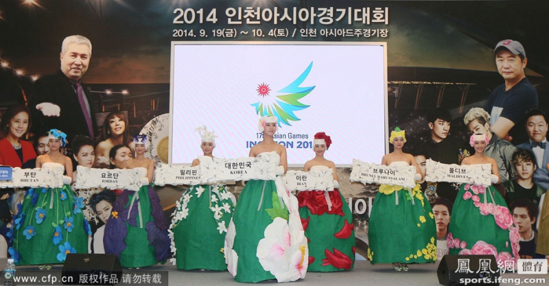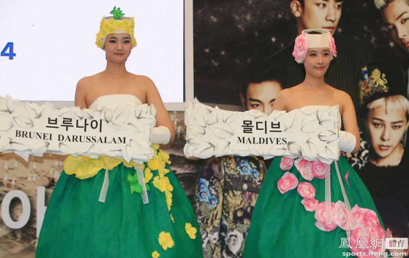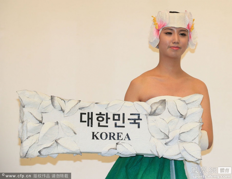 8月27日,韩国首尔国立现代美术馆,2014仁川亚运会组委会发布会举牌礼仪小姐服装,造型奇特。